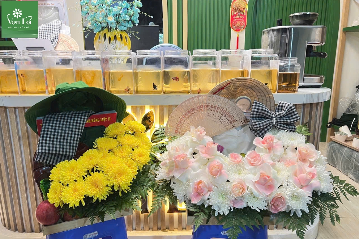- Mâm chung liệt sĩ: Hoa vàng (cúc vàng, lay ơn vàng), bánh kẹo đa dạng, trà, thuốc lá, nước suối, nhang.