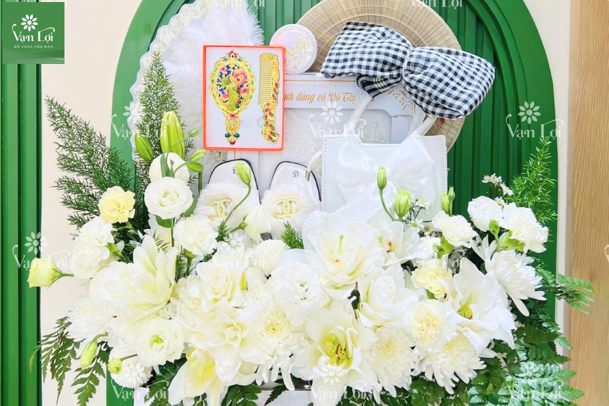- Vật phẩm đặc trưng: Nón lá (đặt ngửa), áo dài/bà ba trắng (giấy hoặc thật), bộ gương lược, son phấn, trang sức, khăn rằn, chai nước suối, nhang nến, vàng mã vừa đủ (không đốt nhiều).